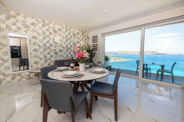Elegant seaview apartment in the heart of Bugibba 🌴 Enjoy modern design, a cozy bedroom, and a bright living area with a private terrace overlooking the Mediterranean — perfect for a relaxing coastal escape 🌊✨