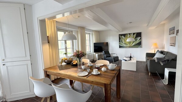 Genießen Sie Ihren Urlaub in unserer gemütlichen und komfortablen Bauernhauswohnung für bis zu 4 Personen. Es erwartet Sie original friesisches Ambiente unter einem Reetdach. Das über 100 Jahre alte Bauernhaus liegt eingebettet in viel Grün. Auf der zur Wohnung gehörenden Südterrasse, ausgestattet mit Strandkorb und Gartenmöbeln, können Sie wunderbar entspannen und die Seele baumeln lassen. Im Eingangsbereich finden Sie eine Diele mit Garderobe vor. Weiter geht es in den lichtdurchfluteten Wohn- und Essbereich mit vollausgestatteter, offener Küche, hier macht das Kochen richtig Spaß. Moderne friesische Behaglichkeit findet sich in der geschmackvollen Einrichtung und mit viel Liebe zum Detail wieder. In den beiden Schlafzimmern mit Doppelbetten finden Sie erholsamen Schlaf. Im geräumige Duschbad findet sich eine grosse, bodengleiche Dusche. Freuen Sie sich auf wundervolle und ruhige Urlaubstage bei uns.