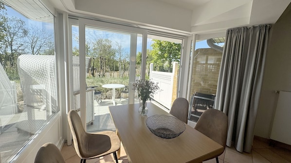 Im Haus Luna II befindet sich die Wohnung Kuddel 15. Mit einer Größe von 75qm bietet sie ausreichend Platz für bis zu 4 Personen. Durch ihre Bodenbeläge, Designerparkett und/oder Fliesen, ist die Wohnung für Allergiker geeignet. Von der mit einer Garderobe ausgestatteten Eingangsdiele aus führt eine gradläufige Treppe in das Obergeschoss der Wohnung. Hier befinden sich zwei Schlafzimmer. Das eine ist mit einem Doppelbett (180x200cm, getrennte Matratzen) und das andere ist mit zwei Einzelbetten (90x200cm) ausgestattet. Das Zustellen eines Kinderreisebettes ist räumlich kein Problem. Ein solches kann auch mitgebucht werden. Abgehend von der Eingangsdiele im Erdgeschoss betreten Sie einen großzügigen Wohn-Essraum mit voll ausgestatteter Küchenzeile, gemütlicher Sitzecke mit Fernseher und einem Essbereich. Sie haben kostenlosen Zugriff auf das WLAN. Das moderne Duschbad verfügt über eine begehbare Dusche, WC und Waschbecken sowie ein Außenfenster. Der raumhoch verglaste Wintergarten sorgt für eine angenehme Helligkeit im gesamten Wohn-Essbereich und ermöglicht einen wunderschönen Blick in den Garten. Ebenerdig betreten Sie die von einer kleinen Sanddüne eingefasste Südterrasse. Hier lässt es sich auf den Gartenmöbeln an frischer Nordseeluft frühstücken oder im Strandkorb ein Buch lesen.