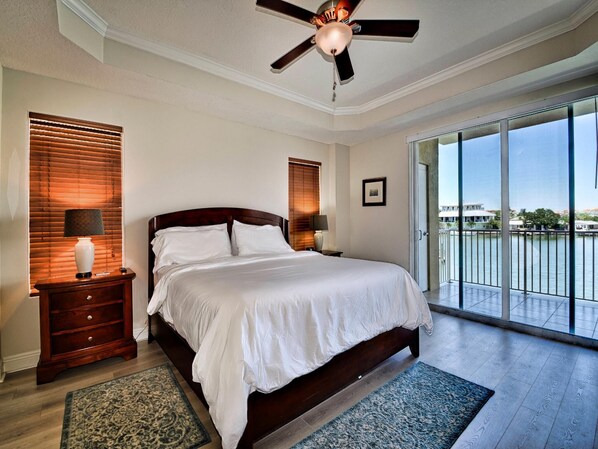 Schlafzimmer 1 - 1 King-Size-Bett mit direktem Zugang zum Balkon durch Glasschiebetüren mit Blick auf die Wasserstraße innerhalb der Küste. 2 begehbare Kleiderschränke. 31 Zoll HD-Flachbildfernseher mit Digitalkabel. Master-Bad verfügt über zwei Waschbecken mit Granitoberflächen. Separate Whirlpool-Badewanne und große Einstiegsdusche.