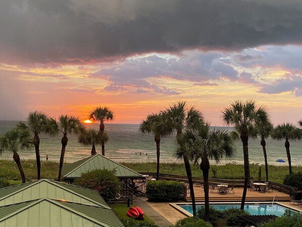 ● Our beautiful beachfront condo is a spacious 3 bedroom/2 bathroom end unit featuring a most desired floor plan offering the largest, full width outdoor private balcony spanning the master bedroom and living room. ● The master bedroom's sliding glass doors open up onto our large, private balcony and the other two bedrooms have sliding glass doors which open out to the outdoors (and not to an interior corridor). Start each day out on our balcony overlooking the ocean with your morning coffee/tea and nightly, there's no better place to take in God's spectacular sunsets. It's our favorite place to dine al fresco, take in the sweeping beach/ocean-front views and enjoy the wonderful sea breezes! ● Enjoy dynamic Gulf/beach views from the living room, kitchen, and master bedroom of our light and bright unit. ● Our fully furnished unit sleeps eight with a king size bed in the master bedroom, a queen bed in the second bathroom and a queen bed and twin daybed/trundle bed in the third bedroom. ● Our unit features beautiful artwork and decor, a wood burning fireplace, two large walk in closets, and a full sized washer and dryer. We also have board and card games, beach games, beach chairs, towels and umbrellas for your use. ● There are televisions in all bedrooms and in the living room. ● Utilities (electric, water), high speed internet, cable and wifi are included. ● In addition to all basic kitchen utensils, bakeware and cookware, we have a full size oven, dishwasher, refrigerator, microwave, toaster, coffee maker, mixer, and air fryer. A starter pack of dish soap, hand soap, dishwasher soap, toilet paper and paper towel is provided. ● Our unit has been recently renovated with storm-proof sliding glass doors in the master and second bedrooms and living room and an airy, all-white kitchen remodel with new quartz countertops, new cabinets and drawers, new dishwasher and refrigerator. We also have a new screen door on our front door and screens on all our sliding glass doors, allowing you to open up the unit on cooler days and let the fresh sea air breeze through the condo! It's magical!