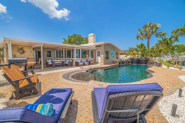 Herons on La Hacienda is a 3 Bedroom/2 Bathroom Grotto Pool Home that will accommodate 10 guests. Welcome to Vacation Perfection! Located just minutes from the beautiful Indian Rocks beach, this home has everything! The backyard provides a heated saltwater pool with a grotto to get a reprieve from the sun, pool loungers, resort-style seating, and an outdoor dining table. You can pull up a chair out on the dock, do some fishing, and catch the dolphins and the sunsets. Inside the home, there are several places to gather with your guests or find a spot of your own to watch a movie. The kitchen has been renovated so staying in and making a meal will be easy. You will want to make Herons on Hacienda your vacation destination year after year!