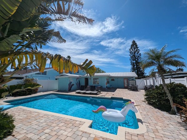 Private three bedroom house with a beach theme and chic furnishings. The backyard has a heated pool, shower, two grills, outdoor table, and lounging areas. The master bedroom has an attached bathroom with a shower. The other bathroom has a bath and shower and is in between the 2 guest bedrooms. The pool is accessed through the master bedroom and guest bedroom. The living room includes a queen sofa bed. A ring camera is on the front door and only records the exterior when you approach the front door. Circular driveway fits 3 cars (street parking is prohibited).