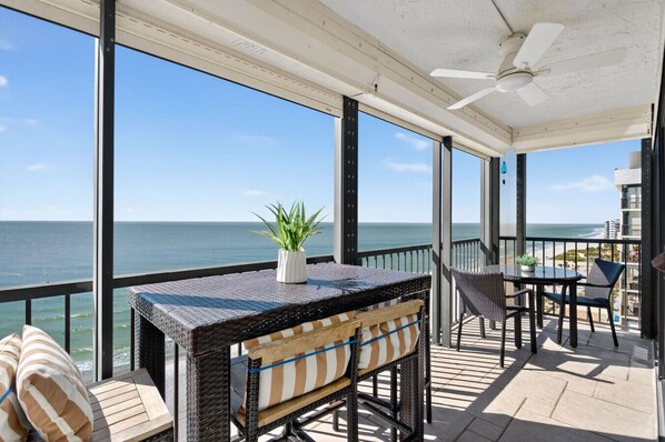Step out onto the extra-large private balcony, complete with a dining area and a unique lounger designed for beachfront napping. Take advantage of the full-size washer and dryer conveniently located within the condo.