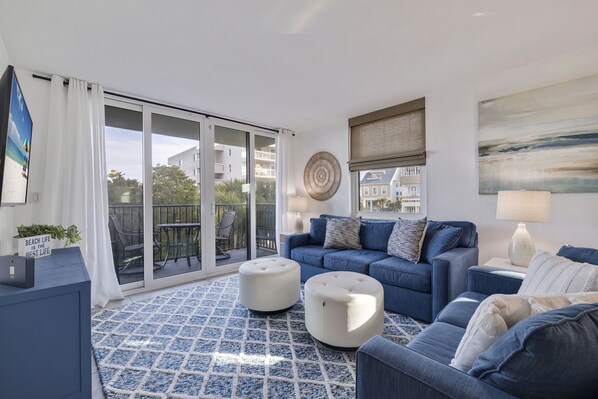 Living Room: Sleeper sofa, loveseat, 2 ottomans, 2 end tables, TV, console table, and patio doors leading to balcony with a small table and 4 chairs.