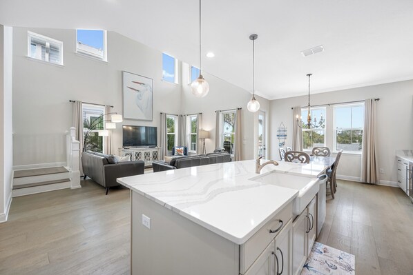 Unwind in style with thoughtfully curated furnishings that elevate the ambiance of this coastal retreat. The main living area is designed for togetherness, featuring an open floor plan with soaring cathedral ceilings that invite in the warm Florida sunshine. The gourmet kitchen boasts granite countertops, stainless steel appliances, a spacious pantry, and a welcoming island—perfect for casual meals or lively gatherings. Sink into plush leather sofas as natural light pours in, creating a bright and inviting space.