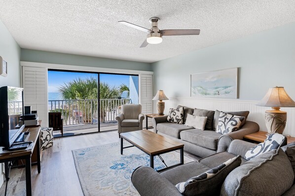 Sleeping accommodations include one king in the main bedroom, 2 queen beds in the 2nd bedroom and a queen bed in the 3rd bedroom. Both bathrooms offer double sink vanities and there is a walk-in shower in the main bathroom and a tub shower combo in the other bathroom. 203 has a Washer & Dryer, Central heat & air conditioning along with ceiling fans in the living room and the 2nd bedroom.
