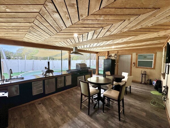 The outdoor screened in patio is meant for entertainment, with voice-controlled lights and all the cooking essentials for creating your meal masterpiece on the gas grill, flat top and a smoker.