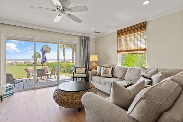 Step inside to find a cozy and well-appointed living space, complete with modern amenities and coastal decor that captures the island's laid-back vibe. The open-concept kitchen is fully equipped, making it easy to prepare meals and enjoy them at the dining table with ocean views.