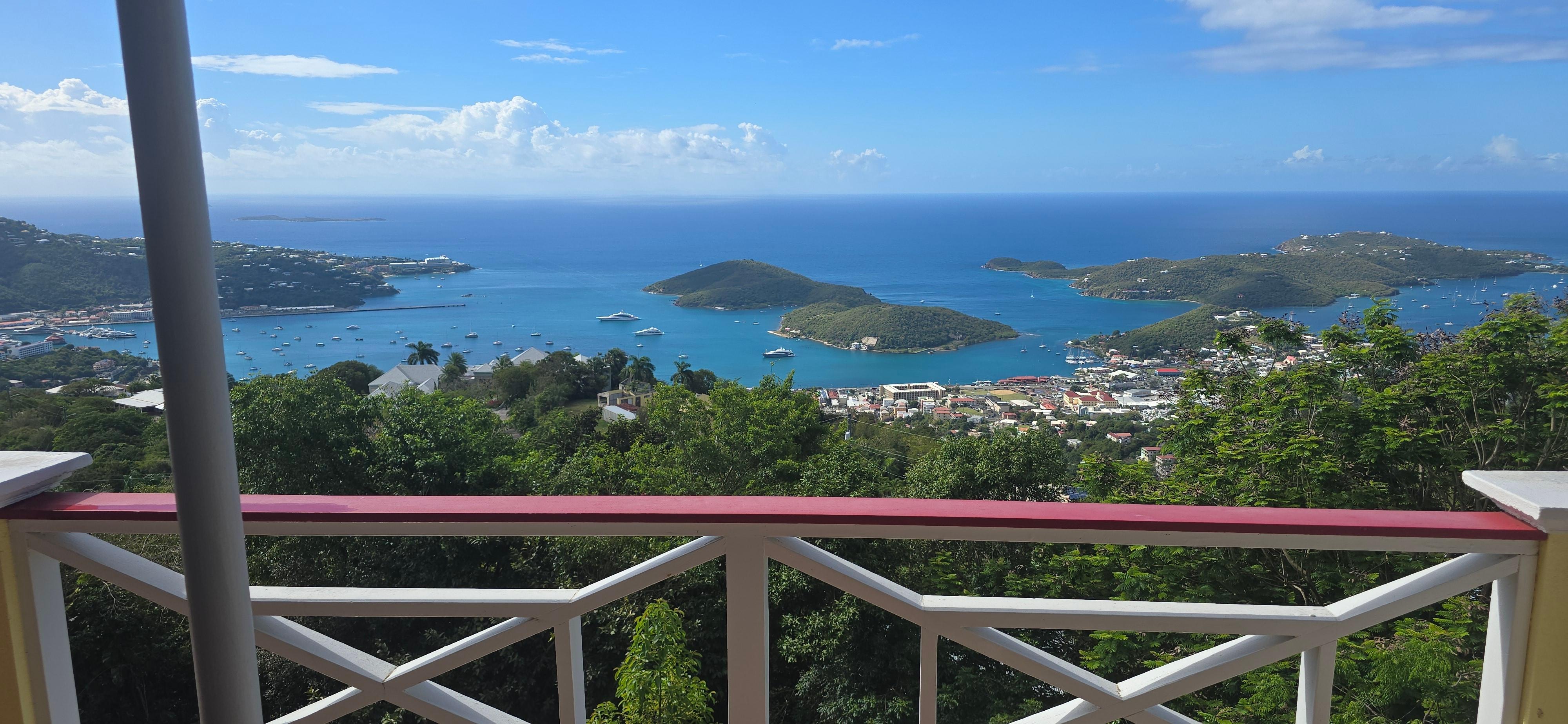 Up the mountain from downtown Charlotte Amalie, you will find the elite villa, Reel Paradise View. Situated on Reel Paradise Estate, this Caribbean home offers one of the most stunning views of the Harbor you will find on St. Thomas. The expansive balcony allows your group to spend your days and nights in the St. Thomas sun and open air breeze. With a 180° view, watch the sun in the mornings as it comes up over the island, the water activity of the Harbor from luxury yachts to cruise ships, and stunning sunsets over the Caribbean Sea.