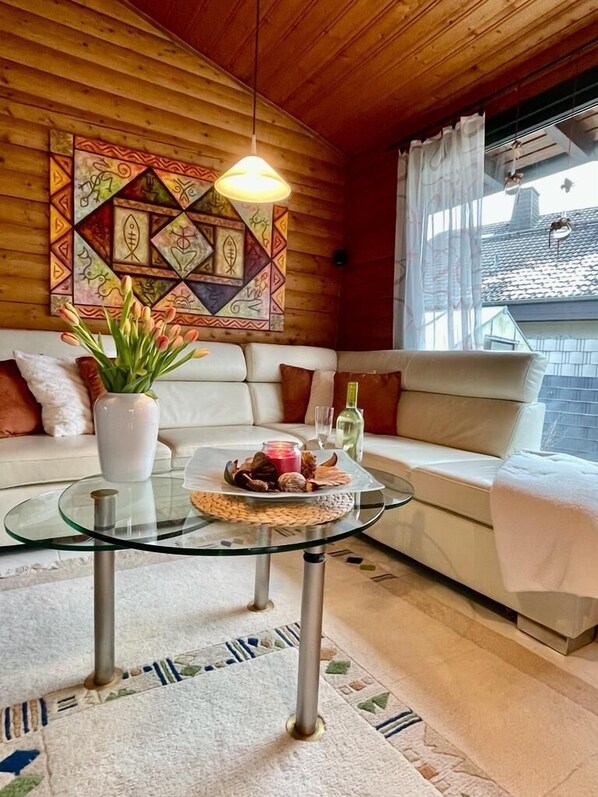 Das freistehende Landhaus in Echtholz bietet eine komplett eingerichtete Küche mit Spülmaschine, Kühl- und Gefrierschrank, Backofen, Kaffeemaschine, Mikrowelle und Cerankochfeld. Der großzügige Wohn- Essbereich mit offenem Wintergarten hat einen direkten Zugang zur Außenterrasse und den Gärten. Die großzügige Eck-Couch im Wohnzimmer bietet Platz für 6 Personen, auf der Sie den Tag mit gemeinsamen Fernsehabenden und romantischer Ofenwärme ausklingen lassen können. Neben den 2 Nebenschlafizimmern befindet sich ein voll ausgestattetes Bad mit Badewanne, Dusche und Wc . In direkter Anbindung zum Elternschalfzimmer befindet sich ein weiteres voll ausgestattetes Badezimmer mit EckBadewanne, Dusche und WC. Der Hauswirtschaftsraum mit Waschmaschine, Trockner Kühlgefriekombination befindet sich angrenzend zum Wohnbereich. Raclettgrill, Fondueset, Grillutensilien etc. stehen ebenfalls für Sie bereit.