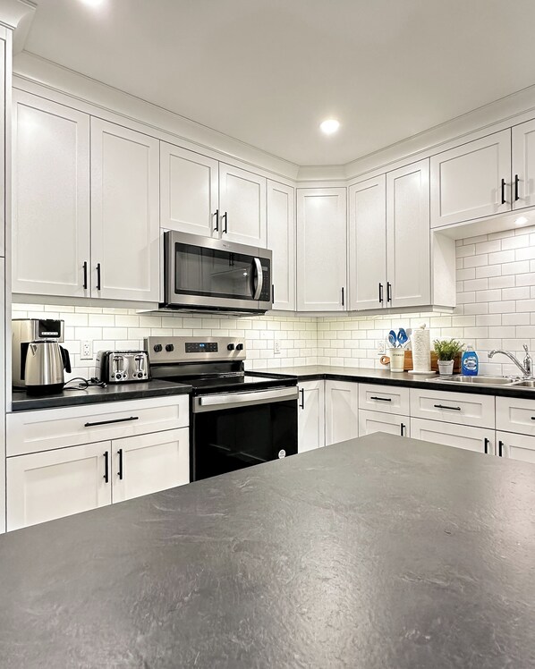 Welcome to Tigh Na Mara Executive Suite. This stunning newly constructed 3-bedroom suite is your ultimate escape from the hustle and bustle of everyday life. Designed with comfort and elegance in mind, Tigh Na Mara offers a private serene retreat nestled in the woods. Whether you're looking for a peaceful retreat or a base for exploring the local area, this suite offers the perfect blend of comfort and convenience. Three bedrooms (one king bed, one queen bed, and two twin beds). The primary bedroom has an ensuite bathroom, and walk-in closet. Two bathrooms (one ensuite with stand-up tiled shower and one bathroom with shower/tub). Full kitchen features large granite island with full size stainless steel fridge, stove, dishwasher, and microwave. Spacious living area features flat screen television with cable and electric fireplace. Dining tables seat four with additional stool seating. Stackable washer and dryer in the hallway. Private deck with BBQ and patio furniture. Private driveway allowing you to pull your car up to your suite. All suites have air conditioning for your comfort. Tigh Na Mara can comfortably accommodate six people.