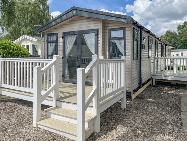 Shower Room: Cubicle Shower, Heated Towel Rail, Toilet. Gas central heating, gas, electricity, bed linen, towels and Wi-Fi included. Back garden with sitting-out area and garden furniture. Private parking for 1 car. No smoking. Please note: There are 3 steps in the garden.. Welcome to your cosy two-bedroom caravan at Beamish Holiday Park where dogs are welcome companions. This home-from-home sleeps six comfortably with a double bedroom featuring a Freeview TV and private access to a separate toilet, alongside a bright twin room and a family bathroom with shower. The open-plan kitchen dining and lounge area invites everyone to gather around the electric fire and TV. A double sofa bed in the lounge provides extra sleeping space. Patio doors open onto a private veranda where you can relax with your four-legged friends by your side. The caravan comes equipped with everything you need including full kitchen utensils, heating, bedding, towels and convenient bathroom facilities.