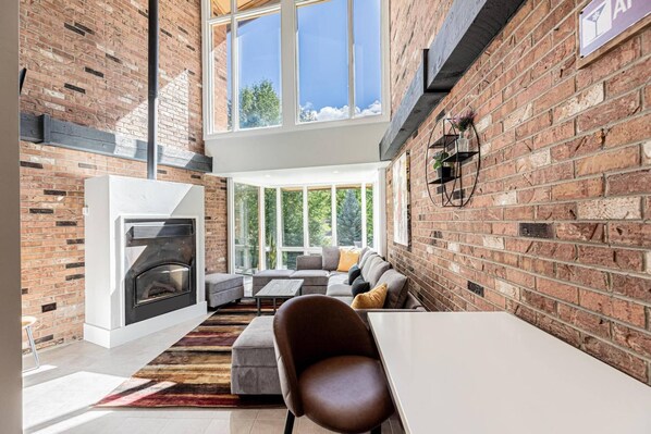 Enter into the main level, featuring a spectacular, brand new modern kitchen and a cozy, bright living area offering extremely high ceilings and a wall of windows. Kick back on the large, comfortable sectional and warm up by the gas fireplace and watch a game, movie or show on the 65 inch LG Smart TV.