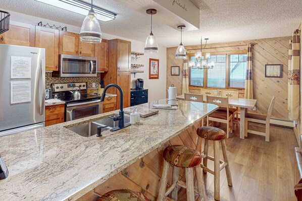 Treat your family or friends or even your significant other to a premium ski-cation at this family friendly, two-story suite! The main level of this home away from home is actually located on the upper floor and offers an open floor plan that seamlessly combines the kitchen, living room, and dining area together. The kitchen may be small, but it boasts gorgeous granite countertops, spacious cabinets, and stainless steel appliances - everything you or the chef of the group could need to whip up savory meals and snacks. Dine indoors or enjoy mealtime in the small, but efficient dining area on the balcony. The spacious living room is perfect for movie nights with your guests; the gas fireplace will keep everyone nice and warm while the TV will provide all the entertainment. The convenience of an on-site washer/dryer will make packing an easy task - there's no need to pack unnecessary clothing when you have this great perk at home. Enjoy amenities such as an outdoor heated pool, two hot tubs, dry sauna, BBQ area with tables, fitness center, and a conference room, perfect for meetings, family reunions, and ski groups!