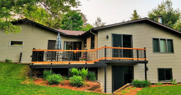 Vier-Zimmer-Haus auf dem 6. Grün am Lake Arrowhead Golfplatz. Schlafmöglichkeiten für bis zu 12 Personen mit drei kompletten Bädern. Nur drei Meilen vom Sand Valley Golf Resort entfernt. Viel Platz zum Sammeln, darunter ein Wohnzimmer mit Holzkamin, ein Familienzimmer und ein Bonuszimmer mit Ping-Pong-Tisch, Tischfußball und Dartscheibe. Große Terrasse mit Feuerstelle und Gasgrill, um die schönen Sommerabende von Wisconsin zu genießen.