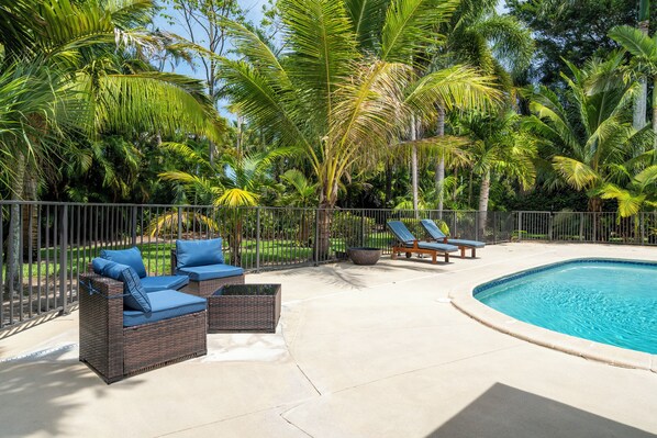Forget your worries in this spacious and serene space. Step away from all the noise and enjoy your own private tropical paradise, lush vegetation surrounding the property. The home is in a beautiful North River Shores community. Large covered patio with dinning area or lounge by the pool in the sun! While you are tucked away we are still very close to shopping and a vast dinning selection!! A true paradise, come relax and rejuvenate!