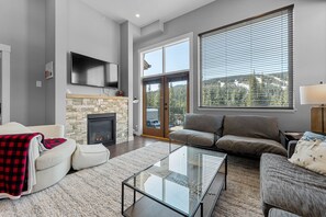 Genießen Sie die atemberaubende Aussicht auf Mt. Morrisey und Mt. Todd vom Wohn-, Ess- und Küchenbereich aus, der über 2 m hohe Decken, Holzböden und einen Gaskamin verfügt. Unser luxuriöses Stadthaus verfügt über eine voll ausgestattete Designerküche, 2 Badezimmer, Waschmaschine / Trockner, einen großen LCD-Fernseher, einen Gaskamin, ein automatisches Befeuchtungssystem, eine Garage für ein Fahrzeug mit internem Zugang und eine große Terrasse mit Panoramablick über das gesamte Sun Peaks Resort.