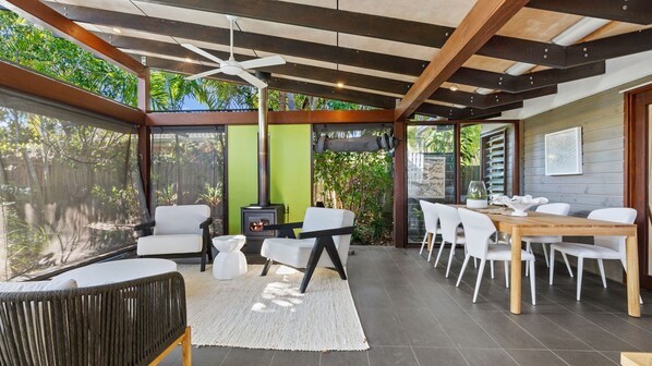 Auf der Rückseite der Hauptresidenz befindet sich ein zweiter Wohnbereich mit geräumigen Tagesbetten und einem großen Wandfernseher mit Foxtel.  Dieser Raum erweitert sich über einen Holzsteg zu den gefliesten Decks des balinesischen Pavillons, wo Sie beruhigende Wasserspiele, bequeme Sitzgelegenheiten in der Lounge, Mahlzeiten im Freien und einen Kamin finden, der diesen kühleren Winternächten Wärme und Ambiente verleiht.  In diesem offenen Heiligtum befindet sich auch die private Hauptschlafzimmersuite, die sich privat zur Seite befindet und über ein eigenes Atrium mit Duschkabine und einer herrlichen, tief luxuriösen, freistehenden Badewanne verfügt.