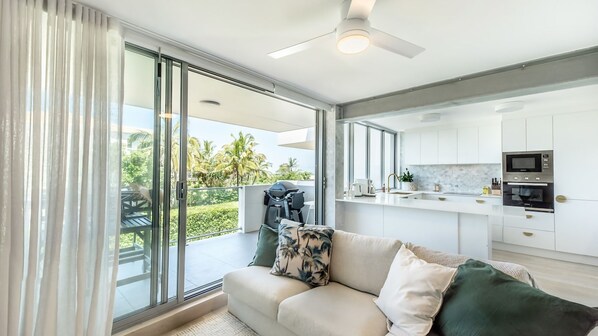 The kitchen includes all mod cons and coffee machine, or walk down to the gourmet cafe 'Chalet and Co' for your morning coffee fix. The luxe master bedroom with queen bed has luxury furniture and comfortable bed and ensuite bathroom. The second bedroom is located at the rear of the apartments.