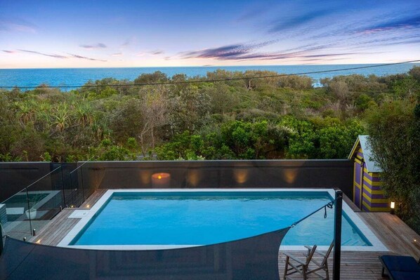 Sweeping views of Marcus Beach. Amazing magnesium heated pool & spa.Pets welcome