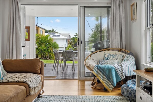 Welcome to Tooway Beach House, a relaxed and stylish two-story holiday home where comfort meets coastal charm. Sleeping up to 8 guests, this pet-friendly retreat is perfect for families or groups seeking sunshine, space, and a peaceful location only a short walk to Moffat or Dicky Beach. Step inside and unwind in the cosy chill-out zone, complete with bean bags and a Smart TV, the ideal space for the kids after a day at the beach. Continue through the home into the open-plan living area featuring a modern kitchen, dining space, and comfortable living space with a sofa, smart TV, an air conditioning unit and beautiful timber floors throughout. The living room opens onto a large deck with an alfresco dining table, outdoor sofa, and BBQ, all overlooking a lush garden with ocean glimpses. The spacious yard is fully fenced, perfect for kids and pets to play safely. Whether you’re seeking beachside adventures or a quiet place to recharge, Tooway Beach House has everything you need to feel right at home.