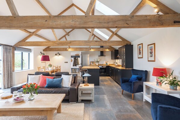The space: The Barn is a detached, single storey, large open plan living space that has been renovated over 2023/24 to an exceptional standard. The vaulted ceiling with exposed beams adds rustic character and gives a feeling of light and space. Enter through your own private entrance from gravelled off-street parking that leads to an enclosed private garden. Through the entrance hall and spacious boot room lies an open plan kitchen with island, dining and sitting area centred around a wood burning stove and smart HDTV. The kitchen is fully equipped including electric oven and induction hob, microwave, fridge/freezer and separate drinks fridge, toaster, kettle, Nespresso coffee machine, dishwasher, crockery, cutlery and cooking utensils. There is a dining table (seats 6) and more informal seating at the island. The sitting area can comfortably seat 6 people around a Hwam wood burner. Along the hallway are two bedrooms, one king size double with en-suite bath/shower, and one twin/super king size with separate shower room. (The twin beds can be zip locked together to make a super king size bed.) Feather filled pillows and duvets of various togs, cotton bed linen and fluffy towels are provided with guest comfort top of mind. A utility room lies off the boot room with a butler sink, washing machine (separate tumble dryer available on request), clothes rack, iron and ironing board. There is underfloor heating throughout and wireless broadband. Outside the Barn is a fenced off, dog friendly garden with patio seating area, fire pit, BBQ and spectacular views of the setting sun on the surrounding fields.