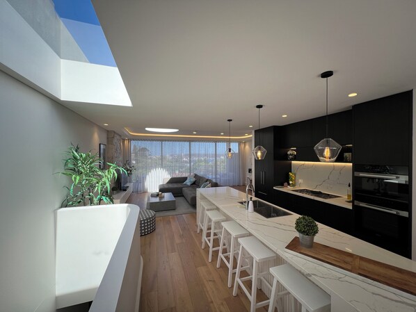 • Kitchen with all amenities including large oven/hob, dishwasher, marble surfaces and breakfast bar