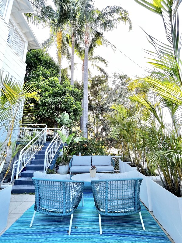 Ein weiterer Außenbereich ist unser preisgekrönter tropischer Landschaftsgarten im hinteren Teil des Gebäudes. Der Garten hat einen großen Esstisch und Stühle