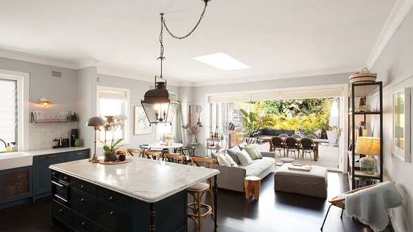 - Wifi - Large private outdoor space with leafy aspect - Alfresco shaded dining terrace - Large BBQ - Outdoor sofa area - Spacious open plan living room, with stunning interior design - Seating area and TV - Large kitchen area with island - Breakfast bar - Indoor dining table - Single level home - Family bathroom - Bathtub - Study area for working - Free and untimed street parking available - Longer stays welcome - Easy public transport links nearby (Bus stop on your doorstep) - Walk to Bondi Beach within 15 minutes