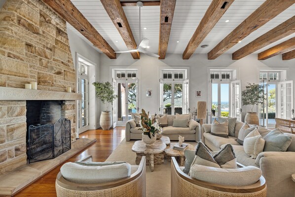 Step inside to discover a bright and airy living room, where large windows open onto breathtaking views. Exposed wooden beams and a stone fireplace add an authentic charm, making it the ideal space for cozy evenings.
