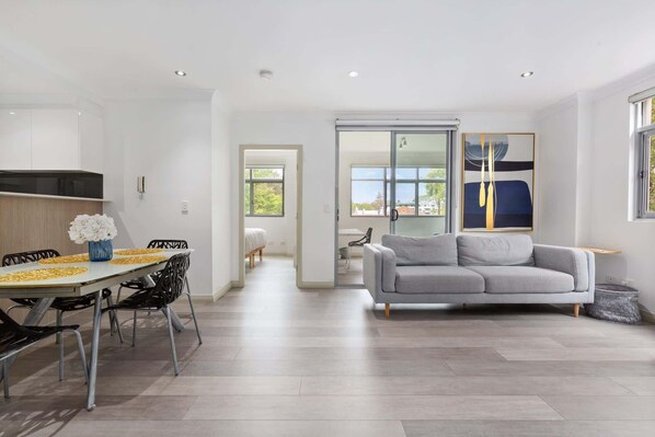 Designed with both comfort and practicality in mind, this generously sized apartment is ideal for professionals travelling with family or colleagues. The open-plan living area is filled with natural light, offering ample seating and a relaxed setting for downtime or casual meetings. A dedicated workspace and a stationary bicycle add convenience for work-life balance while on the move.