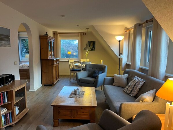 Die gemütliche 3-Zimmerwohnung für 1-4 Personen (ca. 60m²) befindet sich in der 1. Etage der Doppelhaushälfte.