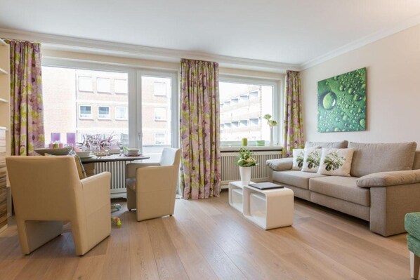Das geschmackvolle Wohnzimmer ist einladend gestaltet und bietet ein gemütliches Sofa sowie TV und HiFi-Anlage. Der Esstisch für zwei Personen schafft die perfekte Atmosphäre für gemeinsame Mahlzeiten. Vom Wohnbereich haben Sie Zugang zum großen Westbalkon, ausgestattet mit Tisch und Stühlen sowie Relax-Liegen, auf denen Sie den Tag bei einem Buch oder einem Glas Wein entspannt ausklingen lassen können. Ein weiterer Balkon in Nordausrichtung sorgt für zusätzliche Rückzugs- und Entspannungsmöglichkeiten.