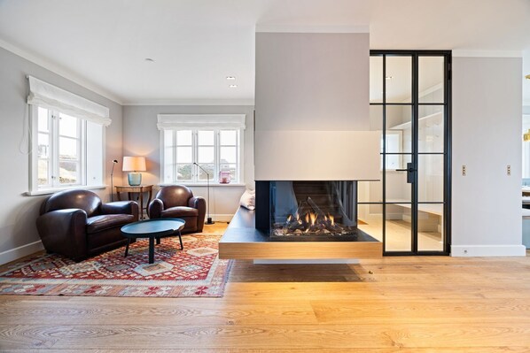 Der offene Wohn- und Essbereich beeindruckt mit einer stilvollen Einrichtung und einer einladenden Atmosphäre. Der große Esstisch, ein rustikaler Brauhaustisch in einer sonnigen Sitzecke, lädt zu geselligen Mahlzeiten ein. Gegenüber befindet sich die moderne Kochinsel, die die offene Raumgestaltung perfekt abrundet. Der elegante Gaskamin sorgt an kühleren Abenden für wohlige Wärme und Gemütlichkeit. In der Sofaecke oder den zwei bequemen Ledersesseln können Sie entspannen und die einmalige Aussicht auf die Dünenlandschaft genießen.