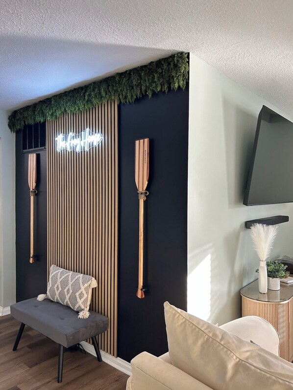 Upon entry, you will be met with a light and bright, freshly renovated interior. Our living room offers a comfortable space for you to cool off and relax after a nice long day at the lake. Newly added for the 2024 season is a pull out couch. Walking through, be sure to stop at our “Frog House” feature wall and snap a few photos for your social media with our greenery and LED lighted wall. From there, you can rock, paper, scissors, with your friends or family members for either the King bedroom or Queen bedroom with a shared bathroom located between the two. After you figure out where you are going to crash for the night, you will be met with our eat-in dining room and open kitchen concept with all the kitchen necessities you could think of. The kitchen was fully renovated the Spring of 2024. Off to the right you will notice a doorway with our stackable washer and dryer unit so you are able to travel home with clean clothes before you leave and it also has a half bathroom there as well. Continuing on from there (the kids probably already found it) you will find our double bunk room! Featuring 2 twin over full bunks, a fireplace and sliding glass door with access to our backyard oasis. Hang out on the patio at night by the propane fire pit and on the comfy sectional or play a game of putt putt in the alley located just off the side of the house. You can sit back and enjoy all the live music on the weekends that you can hear playing from the various local venues.