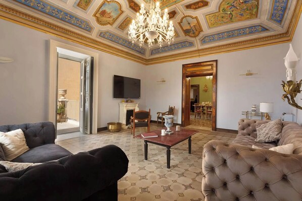 The apartment is quite grand, high ceilings, painted ceilings, large common areas, modern kitchen, 3 bedrooms, 3 bathrooms, large balcony. First time in Ortigia and would recommend Ortigia and the apartment to anyone. The apartment is close to La Pizza Duomo. It’s a great location. The check-in process was easy. Would come back to Ortigia and to this apartment!