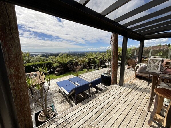 Drive through a vista of ferns, over a small water ford up a country drive way to a property with stunning views from Mt Maunganui - Matakana Island. Relax in the hot tub looking out to the harbour, don’t be surprised if a Tui, Kereru or a cheeky fantail swoop through from tree to tree. BBQ on the deck listening to the Morepork call or cook in the modern kitchen with truly breathtaking views. Swimming pool, Water features and privacy. The Homing Pigeons fly surveying the land ducking and diving and ‘Flint’, the Alpaca would love to be hand fed if you wish. Our fish pond out from the deck also homes 3 Axolotls, which can be seen when the sun goes down.