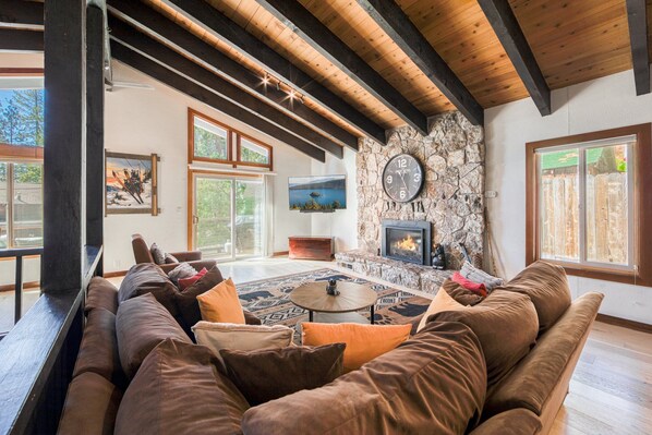 Inside, the spacious main living area welcomes you with soaring vaulted ceilings, a stunning stone gas fireplace, and a plush sectional. Whether it's cozy movie nights on the 55” flat-screen TV or unwinding by the fire after a day of Tahoe adventures, this inviting space sets the tone for both relaxation and entertainment.
