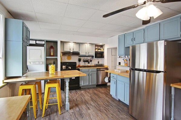The downstairs has a large kitchen, living room and small workspace area. The living room has a sectional, a loveseat and a chair, a fireplace and a Roku TV. The sectional can sleep 2. There is a deck off the kitchen with outdoor seating. Upstairs, you will find the master bedroom with a luxurious king bed and a daybed with a trundle (room sleeps 4). The second bedroom has bunk beds, a double on the bottom and a twin on the top (room sleeps 2). The bathroom is upstairs in the hallway. There's a stackable washer and dryer in the kitchen.