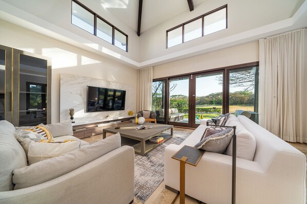The second floor hosts the primary suite with a king bed, private sitting area, spa-style bathroom, and a balcony overlooking the pool and golf course. An additional upstairs bedroom with two queen beds and a dedicated study area with a private balcony complete the space.
