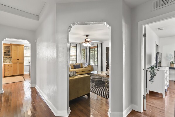The Space: The home is 1,640 SF and situated on a double corner lot surrounded by mature billowing oak trees. The pool and yard is completely fenced off for guest to enjoy privacy while relaxing. Boasting 2 king sized beds with high quality mattresses in 2 of the 3 bedroom and 2 full bathrooms. Brand new sofas and sofa sleeper. make a comfortable setting to watch the game or a movie on the new 50' TV where you can access your streaming services for entertainment. Please note that there is no cable TV. Spend some quality time with your travel buddies cooking a meal in the fully equip kitchen. For those with little ones there is a high chair and pack n play. There is plenty of parking available at no cost. The pool is swim at your own risk. There is no lifeguard on duty.