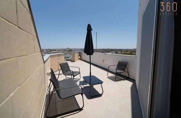 The showstopper — a large, sun-soaked terrace with outdoor dining furniture overlooking Tarxien’s rooftops.