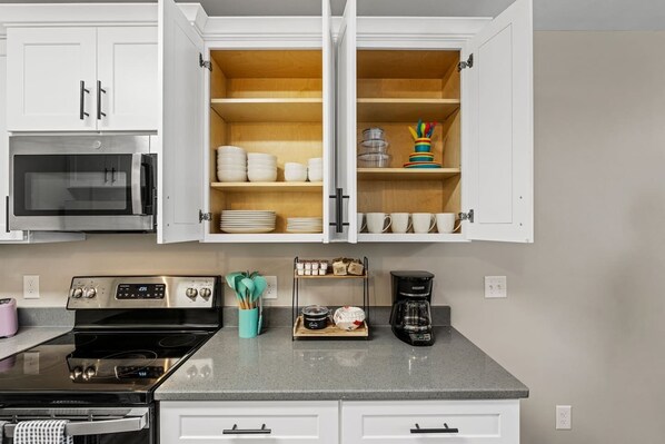 The fully stocked kitchen has everything you need to prepare delicious meals—refrigerator, stove, oven, microwave, dishwasher, and a drip coffee maker with coffee supplies. You'll also find pots, pans, dishes, cutlery, bakeware, and cooking essentials. There is also a dining table that comfortably seats 8 guests.