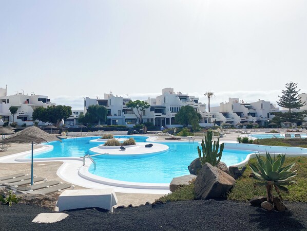 The Los Molinos complex, designed by the artist Cesar Manrique, offers a stunning private pool. The complex is quiet and perfect for relaxation and soaking up the sun. The beautifully kept gardens, playground and large swimming pool provides a safe and tranquil environment. Los Molinos is also situated in an area with numerous restaurants, bars, supermarket, shops, banks, car hire, bus stop and taxi rank all just across the road. Not to mention Playa Bastian beach is just a 5 minute walk away. The golf course and water park are a short taxi ride away. I am confident that once you have stayed in our apartment, you will want to return again and again.