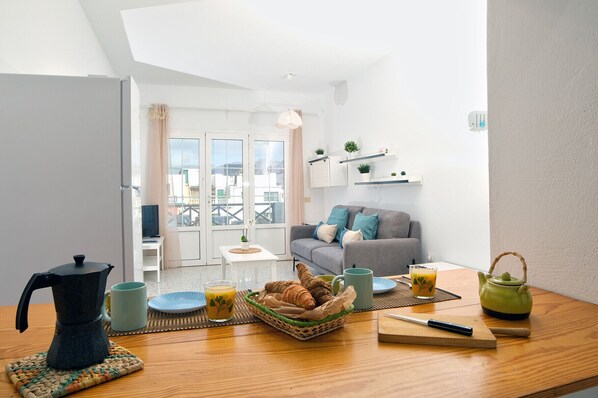 Der Salon ist hell und gemütlich, mit Sofa, Smart-TV und direktem Zugang zu einer privaten Terrasse mit Teilblick auf den Ozean, perfekt, um ein Frühstück im Freien oder einen Drink bei Sonnenuntergang zu genießen. In der gesamten Wohnung besteht Zugang zu WLAN mit Glasfaser, ideal, wenn Sie von zu Hause aus arbeiten oder einfach nur verbunden bleiben möchten.