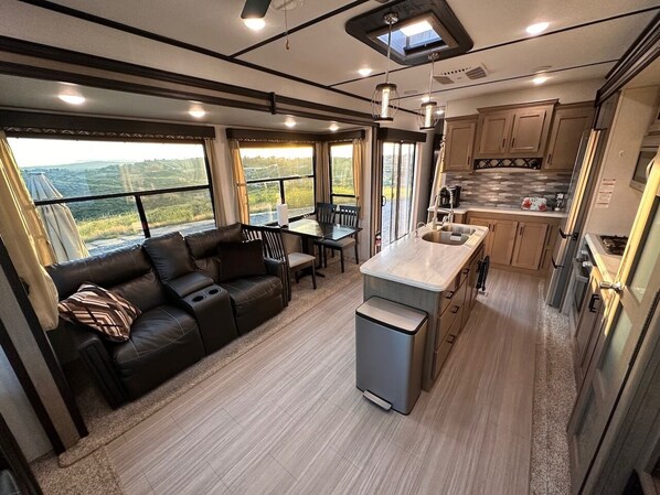 The living area has an Apple TV pre-loaded with major apps such as Disney+, Paramount+, Hulu, TV+. and Netflix. There are two recliner chairs and a couch that converts to a bed. Kitchen is fully equipped with a Combo K-Cup/Ground Coffee; full-size fridge, stove and oven. There is a kitchen island with full size sink.