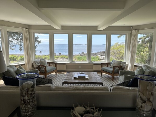 Many ocean views can be enjoyed from this peaceful five-bedroom, 3 full bath and 2 half bath location on 3 acres with a HUGE flat yard. Watch the sun rise within close sight of islands and fisherman hauling their gear. Play on the large yard behind the house. Swim and treasure hunt along the shore in front of the house or at neighboring Drift Inn Beach or kayak from the shore, perfect for some of the rental boats offered from nearby Port Clyde Kayaks.