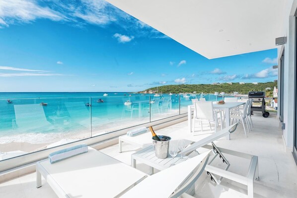 Luxury brand new beachfront residence directly on beautiful Sandy Ground Beach. This spacious second floor unit is over 1,000 square feet. The unit has two terraces, a walk-in shower with handheld & rain shower, a gourmet kitchen, and more. Location is ideal as you can walk to ten plus restaurants. Being on the Caribbean side of the island, the beach is always calm & crystal clear.