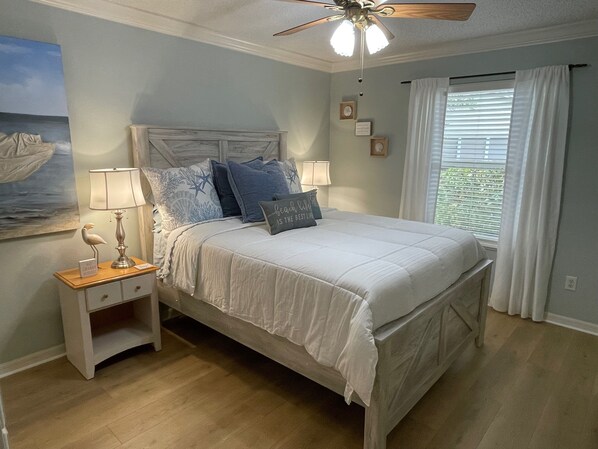 The master bedroom is a true retreat, complete with a plush king bed, a 32" smart TV, and a spacious walk-in closet for all your vacation essentials. The master bath offers a walk-in shower and a spa-like feel, ensuring your comfort from morning to night.
